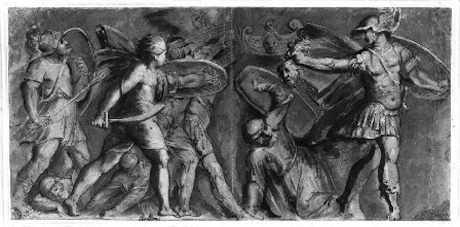 Perseu afasta-se de Medusa decapitada, levando a sua cabeça num saco. A presença protectora da deusa Atena é constante.