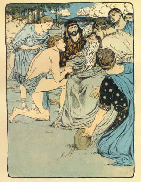 Perseu segura a mão do seu avô, o rei Acrísio, depois de acidentalmente o ter atingido com um disco.