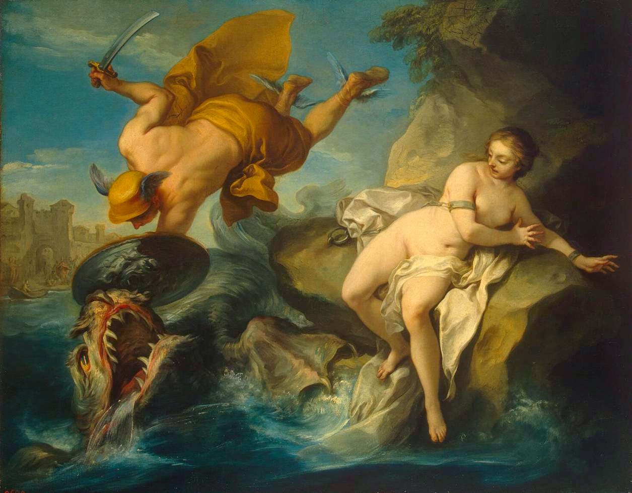 Perseu sobrevive a uma tentativa de assassinato no banquete que celebraria a sua união com Andrómeda. Fineu e as suas hostes são petrificados ao fitarem a cabeça de Medusa. Jean Marc Nattier, 1718.